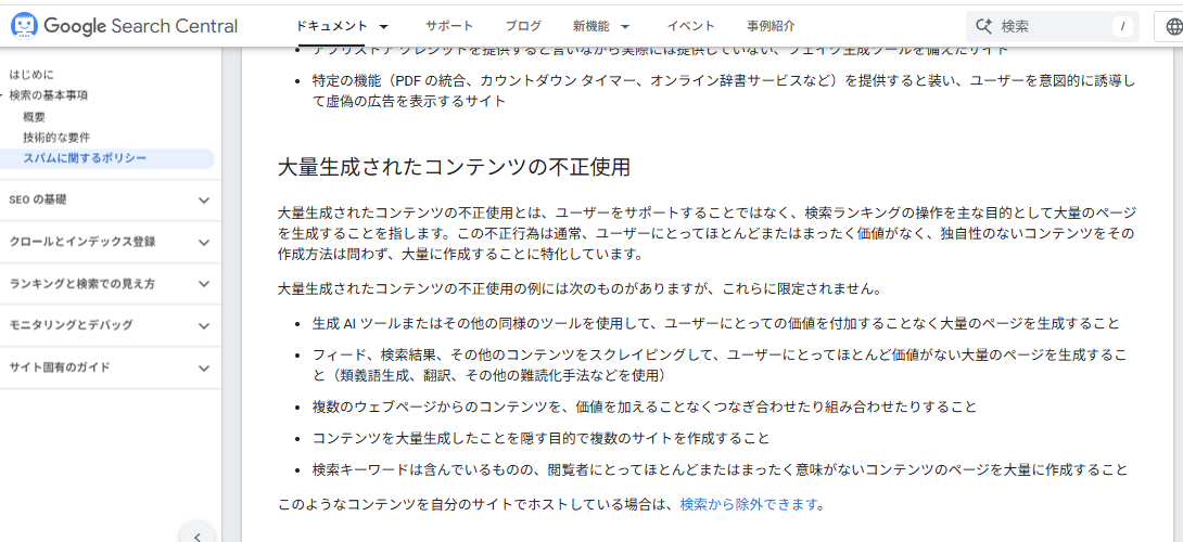 そもそも、Googleは公式より、「AIの大量生成よくないぜ」と注意喚起しています。